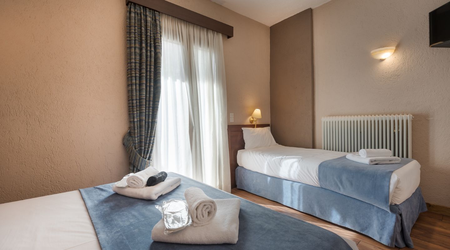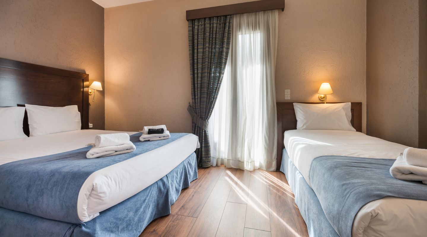 Μέγεθος δωματίου: 15 τ.μ. περίπου. Μέγιστη χωρητικότητα: 3 άτομα, ένα διπλό -queen size – κρεβάτι και ένα μονό κρεβάτι